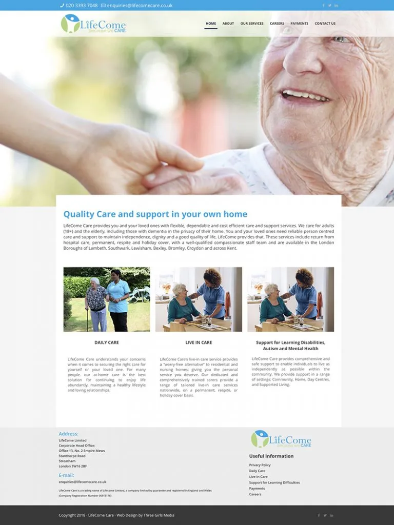 Our team at Three Girls Media embarked on a detailed design process, prioritising ease of navigation and accessibility. We focused on delivering a user-friendly experience that allows visitors to easily find information and make informed decisions about their care needs. The new website features a clean, modern layout with intuitive navigation and a calming colour palette that embodies the warmth and care Lifecome Care provides.